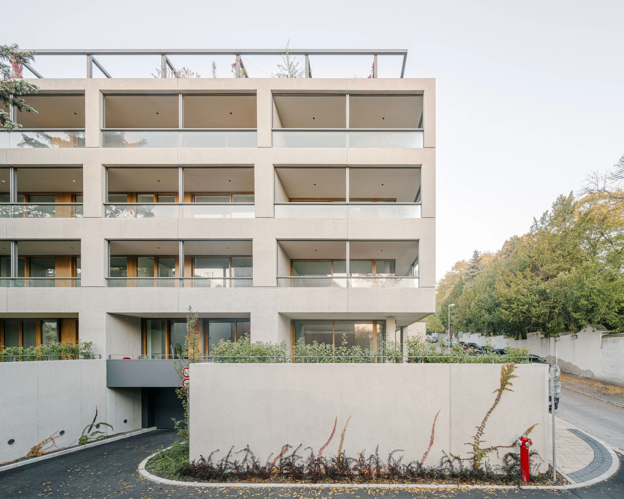 Hausberg predstavuje bytový dom so 46 bytmi, ktorý sa integruje do vilovej zóny Palisád tak, aby pôsobil, akoby tu stál už dlhší čas — nie je výrazný, ale spoľahlivý vo forme aj materiáloch. Fasáda je stvárnená prostredníctvom štokovaného betónu, ktorý svojou štruktúrou pripomína škrabanú brizolitovú omietku susedných domov. Pod touto betónovou „škrupinou“ sa ukrýva drevené jadro, ktoré prechádza aj do spoločných priestorov — schodísk, chodieb, vstupov.